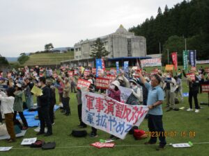岩切達哉さん(日米共同訓練反対宮崎県共闘会議議長)「全ての戦争準備行為に反対。『戦争は破壊であり殺人です』」78年前国連は創設されました。政府は安全保障環境が最も厳しいと言い、防衛費を増やし安全保障体制を整えると言います。なぜ不安を取り除く外交努力をしないのか、いま以上に努力をしてほしい。バイデン大統領の要求のみ受け入れ、国民の暮らしをみない政治を変えなければなりません。共に頑張りましよう!