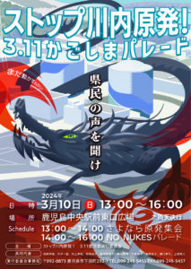 「ストップ川内原発!3・11かごしまパレード」 公開済み: 2024年2月13日更新: 2024年2月15日作成者: 下馬場学カテゴリー: イベント・学習会等 東京電力福島原発事故から13年!そして元旦の能登半島地震での志賀原発の事故。政府の「原発回帰」政策。 「県民の声を聞け!」をスローガンに今年も『3・11集会』を開催します。県民として・主権者として、「原発NO!]の声をあげていきましょう! 関連記事 「被爆ピアノ演奏会」 被爆ピアノ(ひばくピアノ)は、1945年8月の日本への原子爆弾投下によって被爆したピアノです。「ピアノの歴史を感じ、これからも平和が続いてほしいと思いました。 今、世界各地で戦争が起きているが、原爆が使われない世界になっ […] 公開済み: 2024年12月12日更新: 2024年12月13日作成者: 下馬場学カテゴリー: イベント・学習会等 第60回原水爆禁止鹿児島県民会議 第16回鹿児島県護憲平和フォーラム総会 6月29日(土)午後「労働金庫鹿児島支店5階ホール」で開催(代議員42人参加)。初めに原水禁県民会議の総会開催。議長団には本田真知子(鹿教組)・笹井雄一(社青同)両代議員を選出。平井一臣・県原水禁議長は、「先の5.3憲法 […] 公開済み: 2024年8月1日更新: 2024年8月1日作成者: 下馬場学カテゴリー: イベント・学習会等 鹿児島県護憲平和フォーラム主催 5・3憲法記念日集会 2023年5月3日(水・祝)10時~12時 講師:飯滋明(名古屋学院大学教授)氏 「鹿児島市国際交流センター」 鹿児島市加治屋町19-18 公開済み: 2023年4月4日更新: 2023年4月12日作成者: arttankカテゴリー: イベント・学習会等