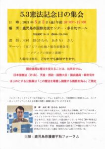5.3憲法記念日の集会 公開済み: 2024年4月18日更新: 2024年4月18日作成者: 下馬場学カテゴリー: イベント・学習会等 5月3日 77回目の憲法記念日を迎えます。「憲法」はこの国のあるべき姿を規定しています。今、このことが大きく歪められています。多くの皆さんと集い・学習しましょう。 2024.5.3.憲法記念日 チラシ最終 関連記事 <鹿児島ブロック> 2・11「紀元節」復活に反対し 思想信条の自由を守る集会 2月11日(土)鹿児島市「よかセンター」8F多目的ホールにて、95名の参加のもと集会を開催しました。 主催者の中村一則代表は、「若い方々には馴染みのない紀元節という言葉だが、歴史を修正し巻き戻そうとする復古的な論調は根強 […] 公開済み: 2025年2月19日更新: 2025年2月19日作成者: 下馬場学カテゴリー: イベント・学習会等, ブロック活動 南薩ブロック平和学習会 「12・7」集会 南薩ブロックでは「12・8」不戦を誓う日の集いを12月7日に開催します。 日時:12月7日(土) 14:30~15:30 会場: 会場: 南薩地域地場産業振興センター 鹿児島県枕崎市松之尾町37-1 テーマ […] 公開済み: 2024年12月2日更新: 2024年12月2日作成者: 下馬場学カテゴリー: イベント・学習会等 緊急!「日米軍事訓練を許さない」9・13かごしま集会 緊急な集会のお知らせです。 9月10日(水)から25日(木)まで、九州各地で日米合同軍事訓練「2025 レゾリュート・ドラゴン(不屈の龍)」が実施されます。九州・琉球弧が、日本列島が日米の軍事訓練場になっています。市民に […] 公開済み: 2025年8月29日更新: 2025年8月29日作成者: 下馬場学カテゴリー: イベント・学習会等