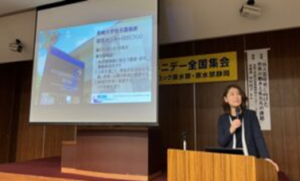 子・准教授の「核兵器廃絶に向けた世界の動きと私たちの課題」と題した、講演を受けました。 講演では、2023年6月現在、世界に核弾頭は1万2520発存在していること、冷戦期以降数は減少してきたものの高性能化がすすんでいること、核軍拡の状況を呈していることや膠着した厳しい現実があるいっぽうで、核軍縮をめざす「新しい風」のきざしがあること、その大きな原動力としての核兵器禁止条約(TPNW)が持つ意味について解説し「核兵器は持続的な未来をもたらしうるものなのか、根源的に考え直す絶好のチャンスです」と述べました。次に、TPNW第2回締約国会議派遣報告、次に、ビキニ市民ネット焼津・かまぼこ屋根の会の秋山博子さんと杉本智子さんが、第五福竜丸の漁労長・見崎吉男さん(2016年逝去)の想いを背負ってマーシャル諸島を訪れ、核被害の調査と現地の人びととの交流を行った際の映像を上映、最後に、静岡選出の高校生平和大使(第26代)の中野愛子さん、渡邊楓花さん、東井上遥華さんが、静岡におけるとりくみ報告とそれぞれの核兵器廃絶に向けた思いを述べ、全国から約180人が参加し集会は終了しました。