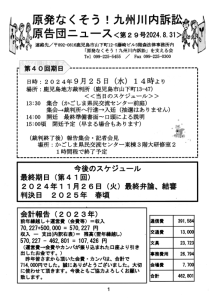 川内原発訴訟最終準備書面が9月25日(水)14時からあります。20年延長に入っていますが、東京福島原発事故から13年経っても、未だに27000人の方々が避難生活を強いられています。そうした中で起こった能登半島地震。志賀原発の被害の詳細はあきらかにされていません。使用済み燃料プール・27回目の稼働延長となった青森県六ヶ所村再処理工場。稼働停止・廃炉は当然のことです。