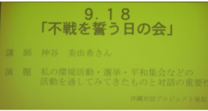 講師の神谷さんは30歳代前半とこれまでにない若い講師で、自らが沖縄で活動した具体的事実(オール沖縄での活動、環境を守る活動、平和集会の活動)をもとに、相手の立場になっての対話が重要であり、戦争の対語は「対話」であるとし、台湾や中国、韓国での対話プロジェクトの活動をとおしてつかんだり感じたりしたことを素直で判りやすく話していただきました。