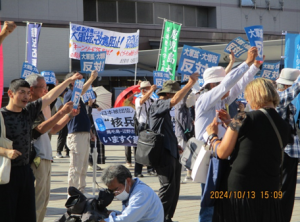 集会は10月13日(日) 午後、JR鹿児島中央駅東口広場で開催、およそ250人の参加でしたが、集会の時間帯には桜島の噴火・降灰があり、会場もうっすら白くなりました。 「戦争反対!」を掲げる6団体(①鹿児島に米軍はいらない県民の会、②戦争しない国づくり応援団、③あいら九条の会、④アイ女性会議、⑤憲法壊すな! 戦争法廃止かごしまの会、⑥鹿児島を戦場にさせない県民の会) の実行委員会により開催されました。