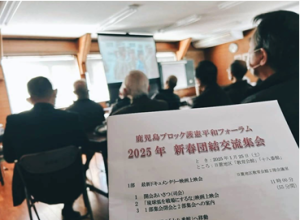 1月25日(土)11時から日置地区教育会館に於いて第1部「琉球弧を戦場にするな(最新ドキュメンタリー映画)の上映会」を、続いて十八番館にて「団結交流集会」を久しぶりに開催しました。県護憲(下馬場代表)、連合鹿地協(喜入事務局長)、立憲民主党(野間県連幹事長)、社民党(大森県連副代表)の皆様からご挨拶をいただき、日置地区・石神高退協会長の音頭で乾杯。坂口洋之日置市議と吉留良三いちき串木野市議から市議選へ向けた決意表明を受けました。