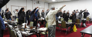 全参加団体の皆さまに壇上に順次登壇いただき、それぞれあいさつをいただきました。また、全ての参加さ屋に漏れなく景品の出るビンゴゲームで楽しいひと時を過ごすことが出来ました。最後に、鹿地区高退協・中島会長の音頭で団結ガンバローを三唱し、来るべき参議院選挙そして5月の日置市議選、11月のいちき串木野市議選に全力をあげて取り組むことを確認し合いました。(当日の参加者65名でした)