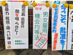 際女性デーの3月8日(土)11時から、天文館日赤献血センター前において、護憲フォーラム加盟の「アイ女性会議」等が呼びかけた街頭行動が実施されました。ミモザの花を道行く人々に配布しながら、女性差別撤廃条約の批准、選択的夫婦別姓の実現、男女雇用機会均等法の一層の充実、県警不祥事の隠蔽や性暴力軽視の体質への批判などを訴えました。当日は、鹿児島ブロック護憲平和フォーラムも手製のプラカードを作成しました。