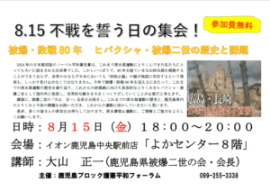 12.8「不戦を誓う日の集会」!~鹿児島ブロック 1945年8月6日広島・8月9日長崎の原爆投下から80年たっても、核廃絶は実現できていません。1954年のアメリカのビキニ―環礁での水爆実験で被曝した、日本の漁船第5福竜丸事件が「原水爆禁止」の気運を高め「核兵器廃絶・被 […] 公開済み: 2026年1月5日更新: 2026年2月3日作成者: 下馬場学カテゴリー: イベント・学習会等, ブロック活動, 反戦・反基地