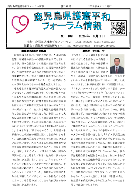 鹿児島県護憲平和フォーラム情報1821号が発行されました。