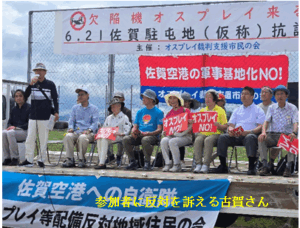 はじめに「市民の会」共同代表で、佐賀大学の「吉岡 剛彦」教授が「佐賀空港を利用する中国人観光客が増える中、敵対心をむき出しにしたオスプレイを見せつけるのは賢明ではありません。佐賀にも、日本のどこにも欠陥機オスプレイはいりません」とあいさつしました。次に、地元のノリ漁師で、駐屯地工事差し止めを求める訴訟を起こしている「古賀 初次」さんが「2020年8月に県知事は、佐賀空港建設時に漁協と結んだ『空港を自衛隊と共用しない』との覚書を反故にしました。また、防衛省が地権者を金で釣り、欠陥機オスプレイまで持ってくることには耐えられません。駐屯地が開設されるこれからが本当の闘いです」と、今後の運動への協力を参加者に訴えました。
